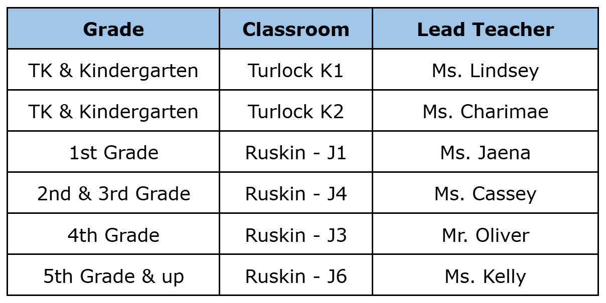 Kindergarten and TK students' classrooms will not be changed and is still located at our Turlock Office (1363 Turlock Lane).
