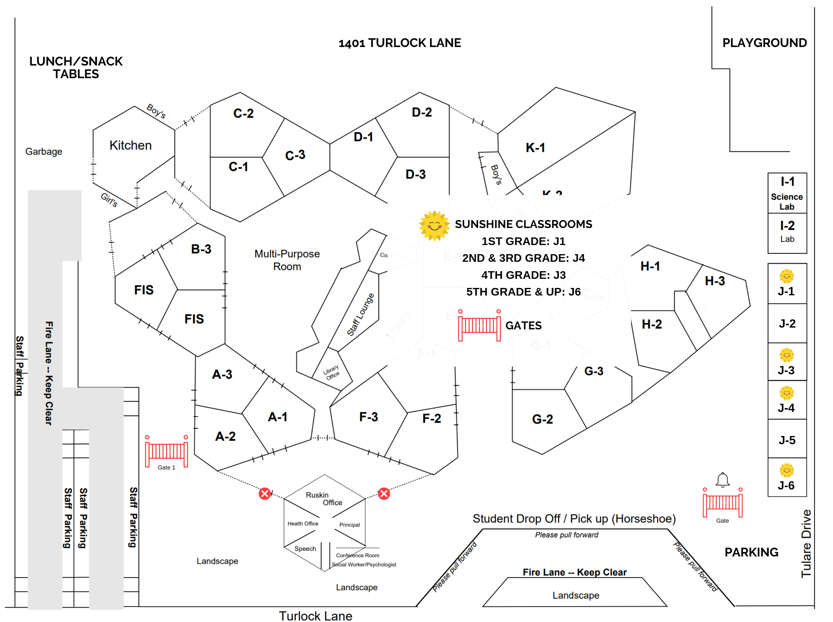 • Parents/Guardians may enter through Gate 1 at Ruskin Elementary and walk their children to the Ruskin Lunch/Snack Tables (1401 Turlock Lane, 1st Graders and up)