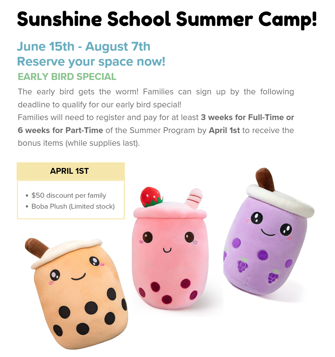 Greetings Sunshine Family, Our Sunshine Summer Program 2026 information is now available! Program details and early bird specials can be found below. Follow Sunshine School on Instagram! Thank you for staying updated with our monthly newsletter! |